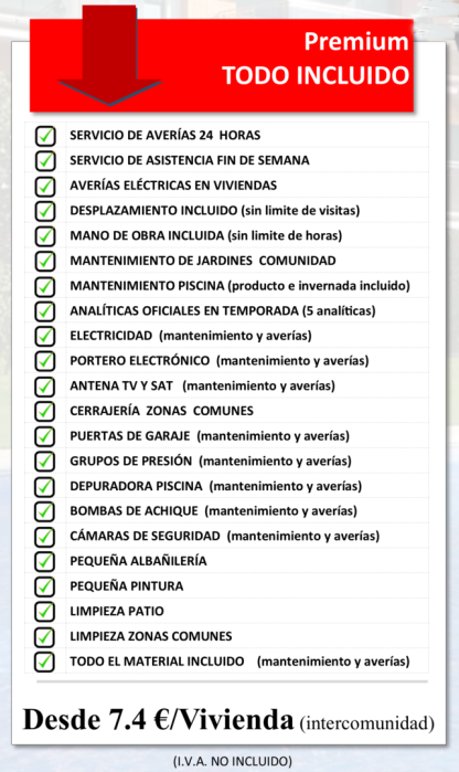 Ahora ponemos toda esta experiencia a tu servicio con un programa de mantenimiento TODO INCLUIDO, donde destacan el servicio profesional y fiable, la calidad, y la rapidez de asistencia junto a la cobertura total de los materiales, mano de obra y desplazamientos.
